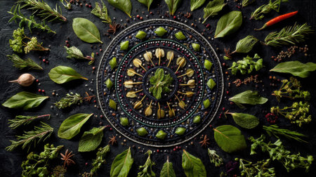 Fresh herbs and spices artfully arranged on a dark culinary background.
