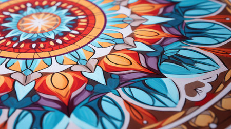 Close-up of a vibrant mandala pattern featuring intricate designs and bright colors. This artistic piece showcases texture and creativity, perfect for various uses.