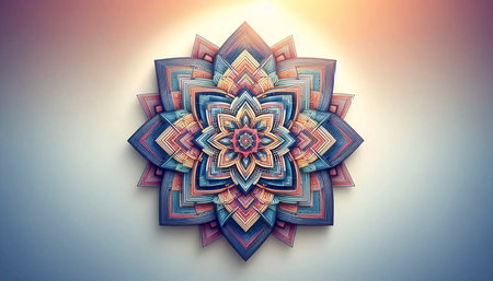 Harmonious digital composition with precise layering and balanced color gradients, nurturing a meditative and spiritually calming atmosphere. Suited for wellness campaigns, yoga retreat posters, mindfulness websites, spa interiors, and holistic therapy materials targeting relaxation seekers. Uniform lighting accentuates symmetry and depth, offering adaptability for h... AI-generated illustration.