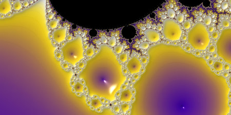 Mandelbrot fractal in the colors of purple golden yellow blue.