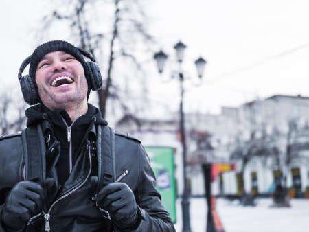 A white young man or adult guy in casual wear is happy to breathe fully in a green park. The concept of happiness and freedom.