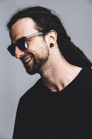 Portrait of a happy young man with dreadlocks and dark sunglasses.