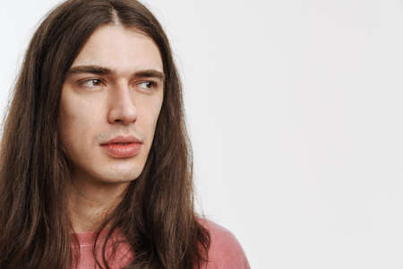 side portrait of young man with long hair in ponytail smiling and looking up by white background