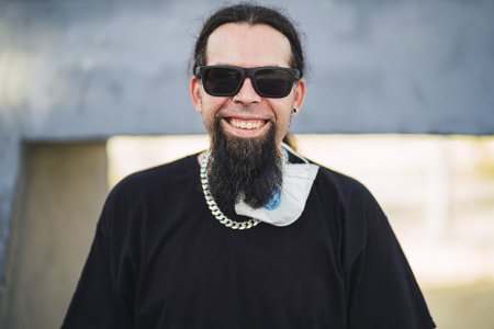 A shallow focus shot of a smiling bearded male with a face mask hanging on his neck at the park