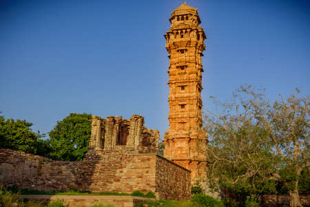 Vijaya Stambha 'victory monument' constructed by Mewar king Rana Kumbha in year 1448 at Chittorgarh fort in Rajasthan, India to commemorate victory over armies of Malwa & Gujarat led by Mahmud Khilji