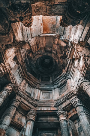 This upward view captures the symmetrical grandeur of an ancient Indian temple's stone dome, with light rays highlighting detailed carvings, corbels, and multi-tiered arches. Ideal for travel ads, history blogs, architecture portfolios, and cultural heritage visuals.