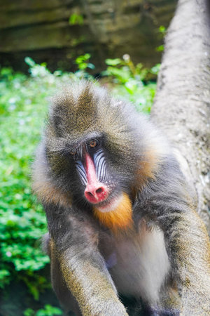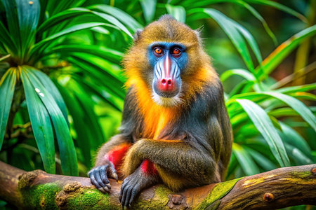 Colorful Mandrill monkey sits on branch in lush jungle