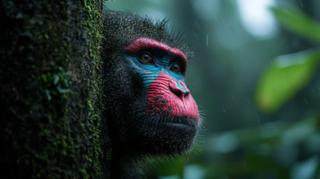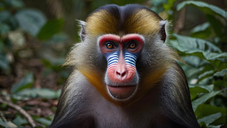 A vibrant mandrill monkey, captured in stunning detail, stares out from its lush jungle habitat Its expressive facial features and vivid colors showcase the beauty of tropical wildlife and the rich tapestry of forest life The photograph highlights the fascinating diversity of nature's wonders AI Generative