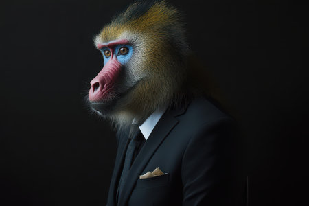A baboon dressed in a formal suit stands elegantly against a black backdrop showcasing a unique blend of nature and sophistication.