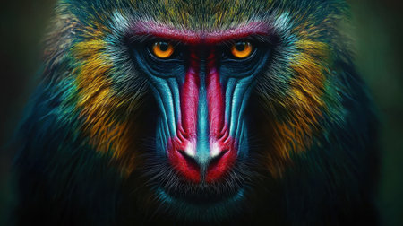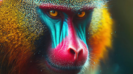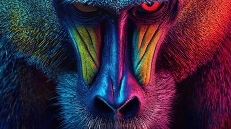 A close-up view of a baboon with vivid colors highlighting its facial features. The vibrant hues bring attention to its intense gaze, creating a captivating visual impact.