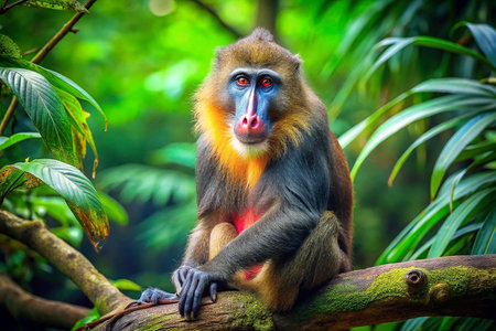 Mandrill monkey sits on branch in lush jungle