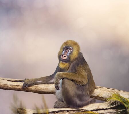 Colorful Mandrill monkey sits on a tree branch