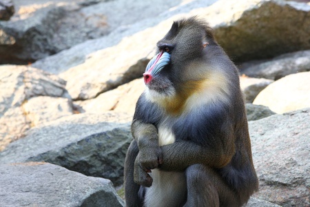Mandrill (Mandrillus sphinx) sitting on a rock