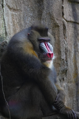 Mandrill sitting on the wall. Mandrillus sphinx