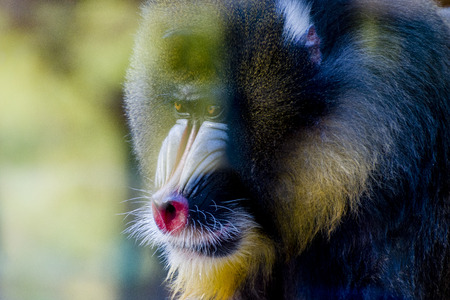 Portrait of male mandrill monkey with red nose.