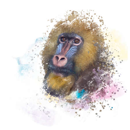 mandrill monkey portrait, tropical primate with a colorful face, watercolor digital painting