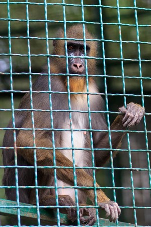 Mandrill Baboon monkey sad face behind a cage