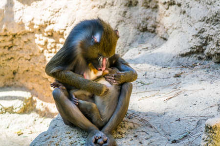 mandrill in closeup with its face and genitals, Vulnerable primate specie from Africa