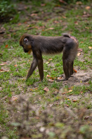 Mandrill monkey cub looking in the grass.