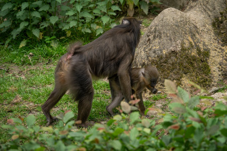 Red butt Baboons sitting on the and picking bugs out of hair Singapore Zoo
