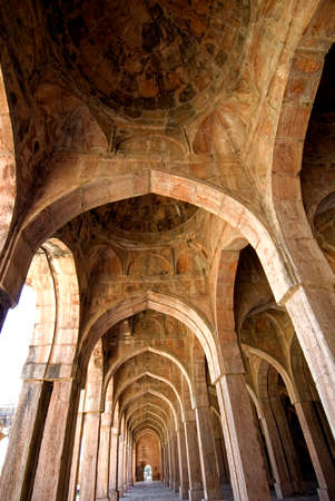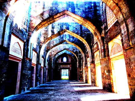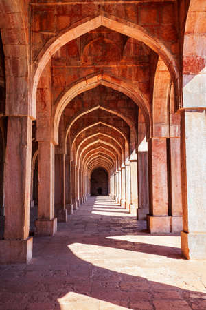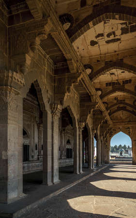Mandu India, afghan ruins of islam kingdom, palace interior, mosque monument and muslim tomb. Sunshine from door in dark corridor.