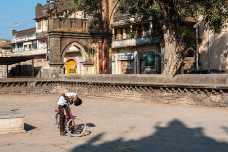 Junagadh, Gujarat, India - December 2018: A young boy works on his bicycle inside an old mosque with an ancient arched gateway in the background.