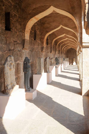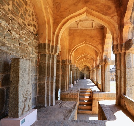 Vaulted corridor of the Hampi temple complex in sunlight. Cultural heritage, ancient architecture of India.