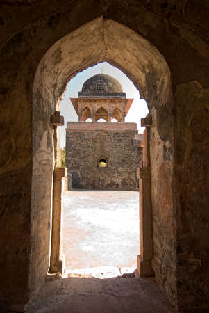 Mandu India, afghan ruins of islam kingdom, mosque monument and muslim tomb. View through door, Hindola Mahal.