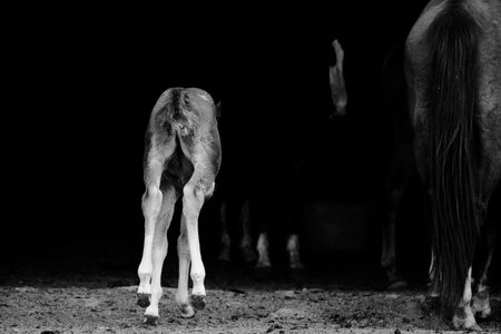 Playful butt horse foal with black background on farm