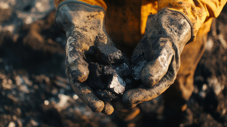 Hands covered in dirt cradle a rough piece of coal, representing the hard work and effort of coal miners at a mining site under natural light.