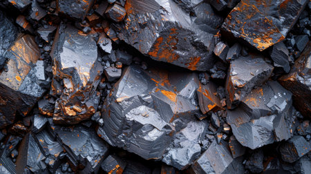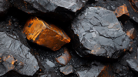 A close-up captures multiple dark rocks with rough, textured surfaces. The grayscale palette emphasizes their depth and rugged appearance. Soft lighting creates subtle shadows. Suitable for illustrating geology, natural resources, or environmental themes. Offers visual appeal for various commercial or editorial applications.