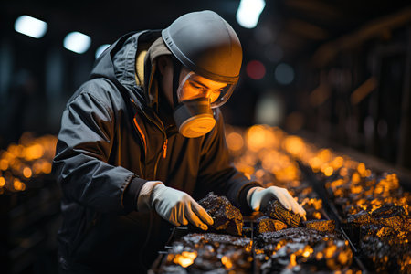 A man is engaged in mining activities, carefully digging for gemstones amid rocky terrain. The image captures the raw beauty of nature and the hard work involved in resource extraction.