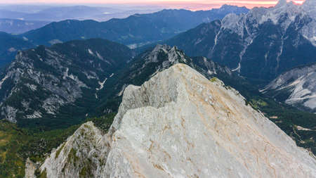 Breathtaking Views From Mangart Peak at Stunning Sunset. Peaks Above Clouds.