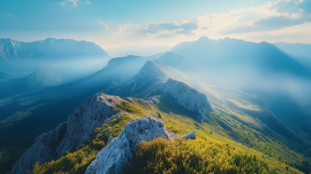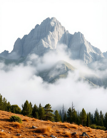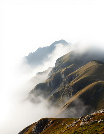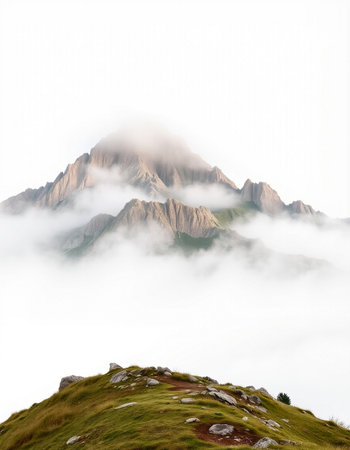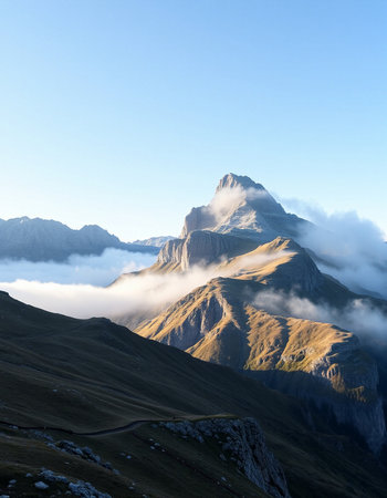 Beautiful top of mountain surrounded by clouds. Generative AI