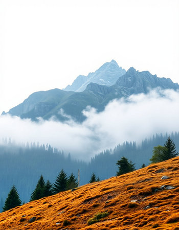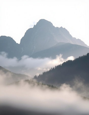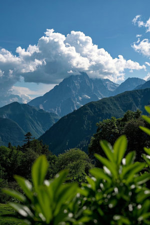 A breathtaking view of towering mountains rises above a vibrant green forest filled with wildflowers during early morning light. Soft clouds hover, adding tranquility to the setting.