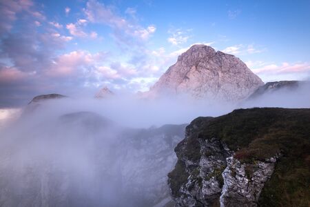 Mountain landscape with fog in the morning. Dolomites, Italy