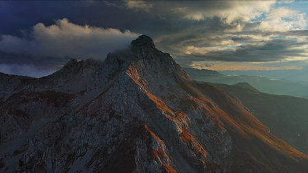 Aerial view of amazing rocky mountains at sunset, Komovi mountains in Montenegro