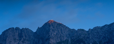 Evening panorama of mountain Svinjak close to Bovec, Slovenia, in a winter time, but without snow. Famous sharp pointed top of mountain just next to Bovec.