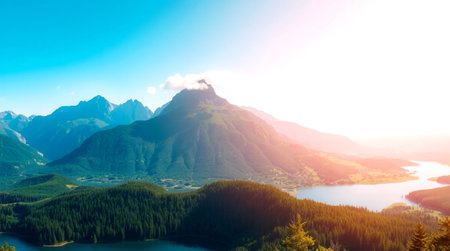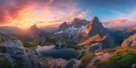 The panorama captures a breathtaking sunset casting golden hues over a majestic mountain range with alpine lakes nestled in valleys. Resplendent.