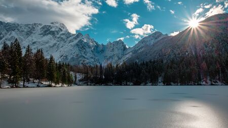 Amazing sunrise in the mountains. Backlight Sunlight with beautiful lens flares and sunbeams. Julian Alps, Triglav National Park, Slovenia, Mountain Slemenova, Sleme.