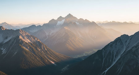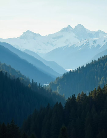 A peaceful view unfolds with towering spruce trees framing majestic mountains bathed in soft morning light. Lush green forest descends into a misty valley, creating a serene atmosphere. Generative AI