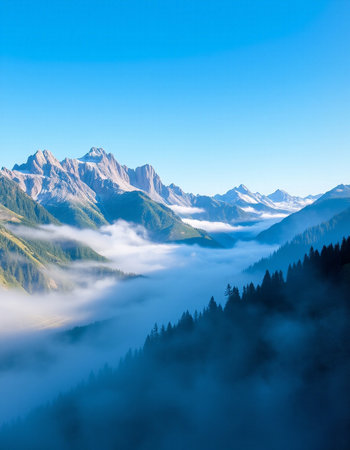 Mountain landscape with fog and blue sky.