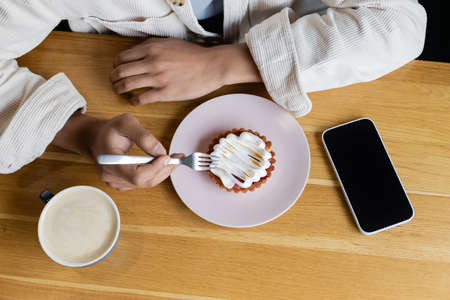 top view of african american man holding fork near tasty tart and smartphone with blank screen