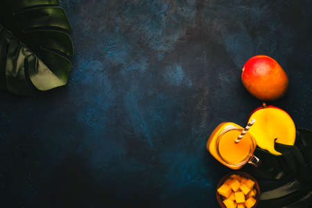 Mango smoothie in glass jar with fresh fruit on blue background, copy space, top view