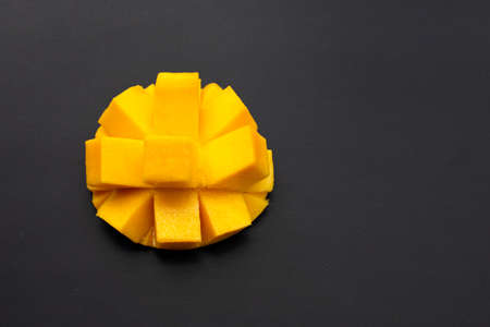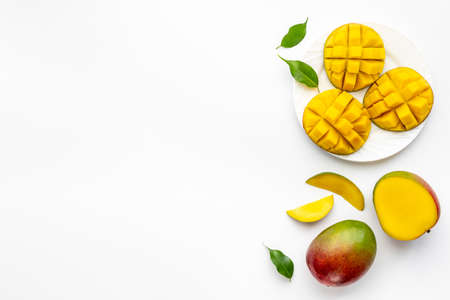 Mango fruit and mango cubes top view. Tropical fruits background