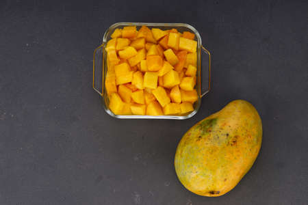 Ripe Mango cubes or cut piece arranged in a glass square container with mango placed nearby on grey color background.
