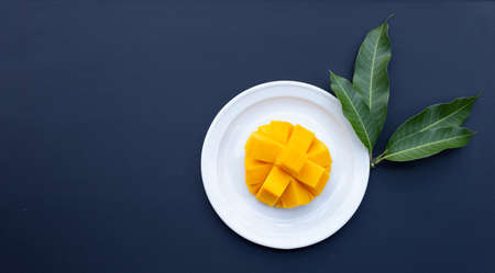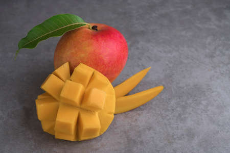 Fresh mango fruit with sliced diced mango chunks on a plate or on leaves as a background