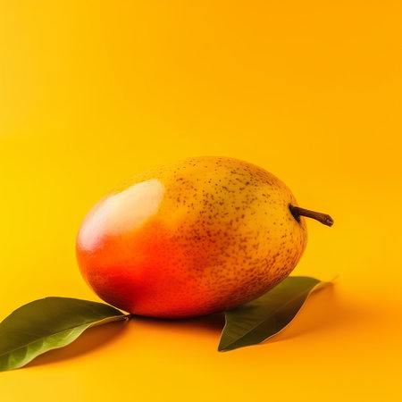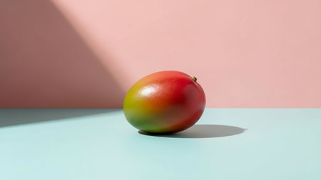 A single, ripe mango rests on a soft pastel background, featuring gentle shadows and sunlight highlights, symbolizing freshness and health.