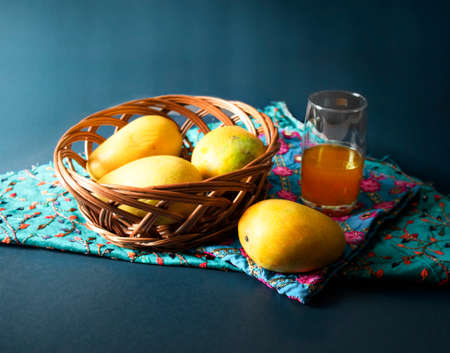 mangoes in basket blue dark background Mango fruits Top view