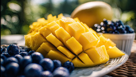 Close-up view of diced mango pieces and a scattering of fresh blueberries arranged on a plate. The mango pieces are a vibrant yellow, and the blueberries are deep blue. The image has a natural, vibrant, and wholesome feel, highlighting the fresh fruit.